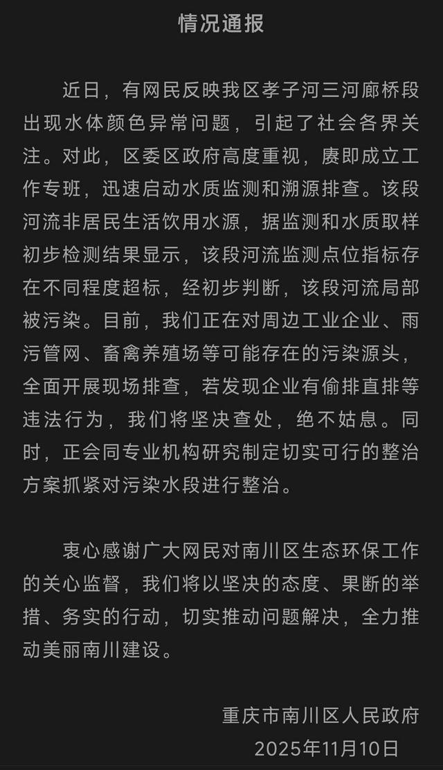 10日晚,南川区人民政府发布官方通报,称已成立工作专班,迅速启动水质监测和溯源排查。